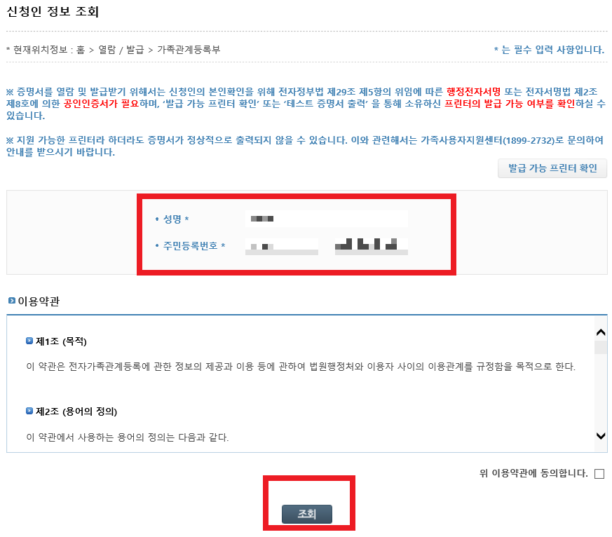 ▼신청인 정보 조회에서 이름과 주민등록번호를 넣고 조회를 눌러주세요. 약관에 동의는 빼먹지 않고 해줍니다.