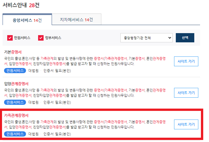 ▼그 중에서 "가족관계증명서"를 찾아줍니다. 찾으셨따면 사이트 가기 버튼을 눌러주세요.