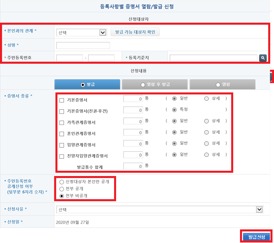 ▼마지막으로 각종 옵션을 선택해 준 다음 발급신청을 누르게 되면 완료됩니다.