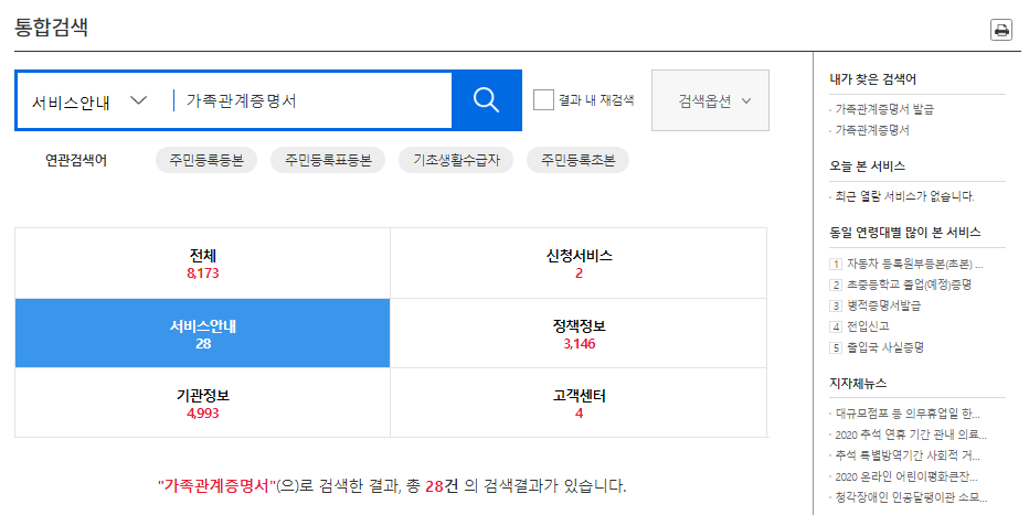 ▼가족관계증명서를 검색한 다음 "서비스 안내" 메뉴를 눌러주세요 28개의 서비스가 안내되고 있네요.