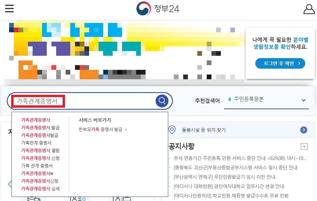 가족관계증명서를 발급하기 위해서는 민원24로 먼저 접속해줍니다. 링크를 눌러 접속하셔도 됩니다.