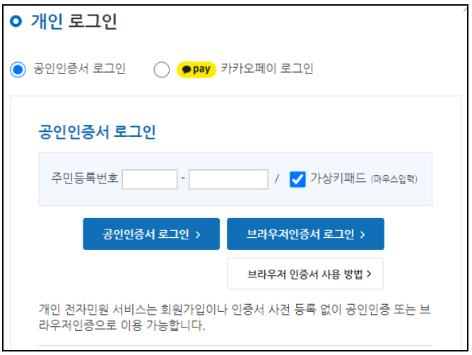 ▼ 공인인증서 로그인메뉴가 등장하게 됩니다. 공인인증서로 로그인을 해주세요. 공인인증서가 없다면 '카카오페이 로그인'을 통해서 로그인을 해주셔도 이용이 가능합니다.