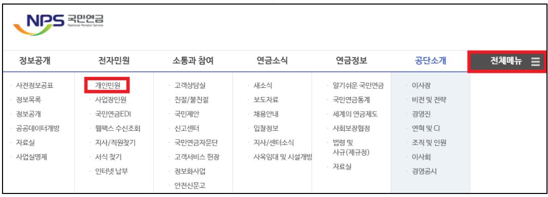 ▼ 국민연금(www.nps.or.kr) 홈페이지로 접속해주세요. 그리고 '전체메뉴'에서 '개인민원'을 찾아서 진입해줍니다.