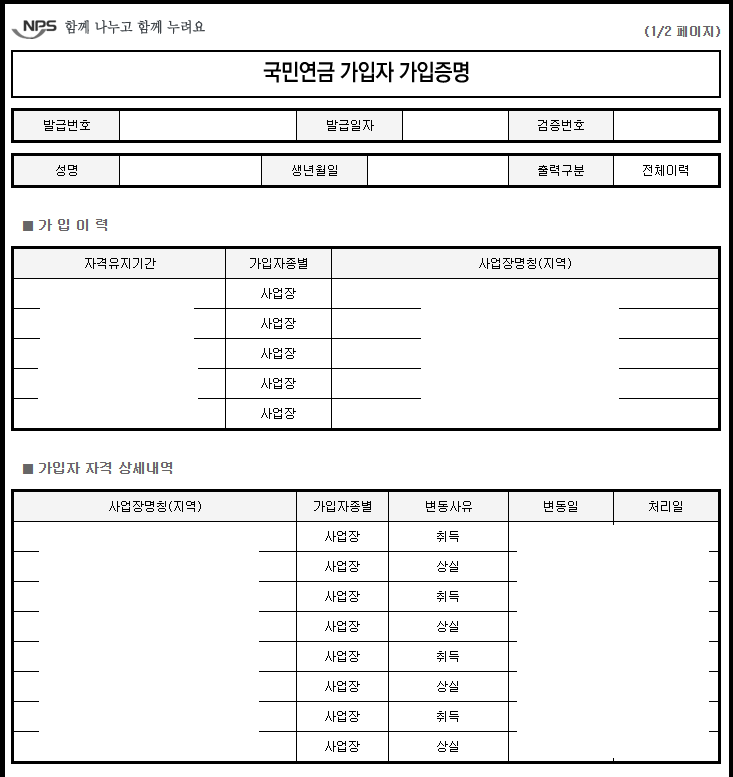 ▼ 아래와 같은 양식으로 국민연금 가입자 가입증명 서류를 발급받을 수가 있습니다. 때에 따라, 경력증명서로서도 사용이 가능합니다.