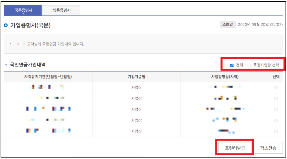 ▼ 가입증명서를 프린트할 수 있는 화면으로 진입했습니다. 만약 일부 특정 사업장만 선택하고 싶다면, 각 특정사업장에 체크를 해주시고 프린터발급 버튼을 누르시면 됩니다. 여기서 국문증명서 혹은 영문증명서 둘 중 하나의 선택도 가능합니다.