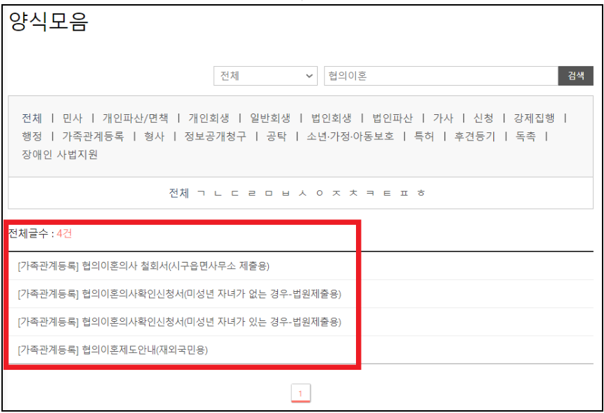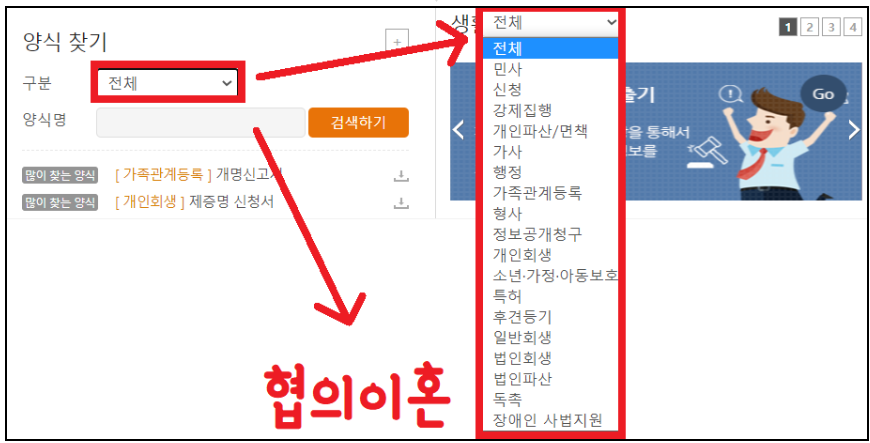 ▼ 홈페이지 하단이나 오른쪽 위의 메뉴에 살펴보면 양식 찾기가 있습니다. 구분은 전체로 놓고, 협의이혼을 검색해줍니다.